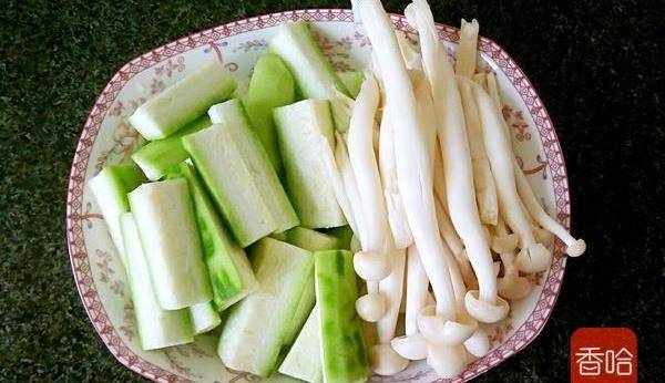 2.絲瓜刨皮切成等長小段,海鮮菇冼幹凈待用。