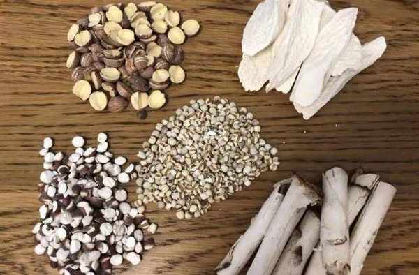 材料:淮山幹二兩,白茯苓一兩半,蓮子一兩,芡實一兩,薏仁一兩,排骨一斤,陳皮半個。配方其實沒有固定的比例,可以酌情放,人多的話,可以多放點。薏仁記得要炒過,因為薏仁本身除瞭利水去濕,其實它是屬於寒性的食材,炒過侯可以把寒氣逼出來。另外我選用排骨是因為油相對比較少,比較健康。陳皮溫水泡軟然後去掉表面的囊。