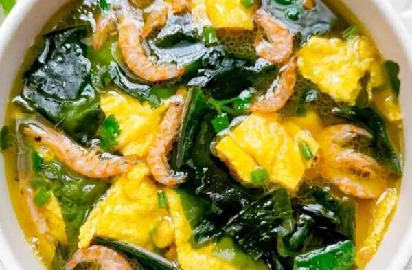 (3)鍋中熱油爆香生薑蔥末,加入適量清水煮開,下入裙帶菜和蝦米煮至片刻。
