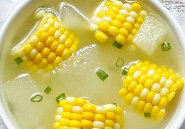 (2)鍋中倒入少許油,下入冬瓜翻炒片刻,倒入適量清水,加入玉米大火煮開。