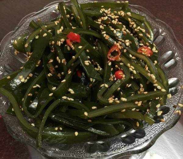 做法:將海帶洗凈,切成細絲後煮半小時撈出放涼。放涼後加蒜茸、香油、醋、味精等調料後,拌勻即可食用。(不需加鹽)