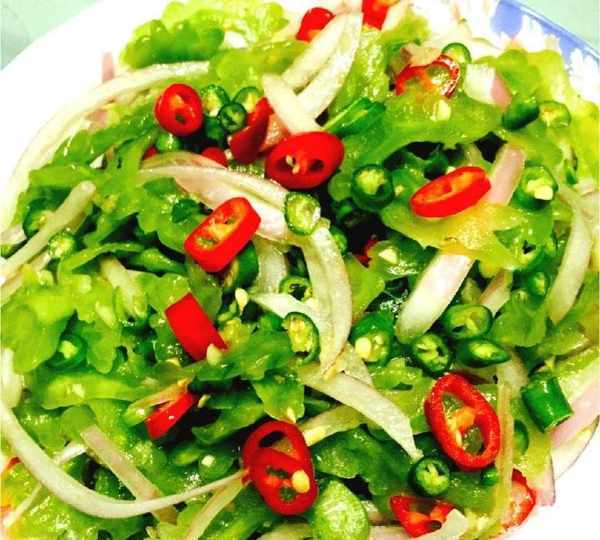 做法:首先將苦瓜一剖兩半,去瓤洗凈後切1厘米寬的條,在沸水中燙一下放人涼開水中浸涼撈出,控凈水分。然後將苦瓜條加辣椒絲和精鹽腦。後,控出水分,然後放涼開水中浸涼撈出,放人醬油、豆瓣醬、蒜泥和熟油拌即可