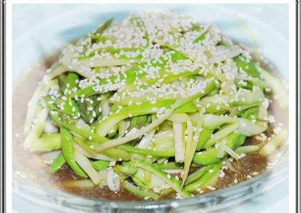 做法:將鮮蘆筍洗凈,削去老皮,然後切成細絲,加入適量的鹽、芝麻醬等調料拌勻,即可食用。