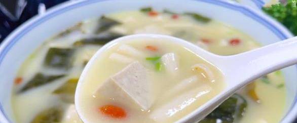 5、將魚煎好,倒進沸水中,用小火熬5分鐘,等到湯變得粘稠之後,將魚排出,接著下鍋,將魚和海藻、海藻一起燉10分鐘。