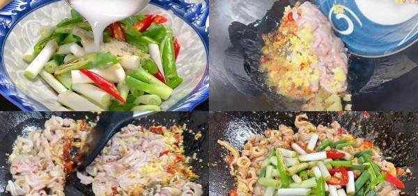 7、將洋蔥、生薑、大蒜倒入鍋內煸炒,將醃過的豬肉片倒入其中,用大火翻炒,加入洋蔥和紅椒,翻炒均勻,最後倒入一份香噴噴的炸豬肚。