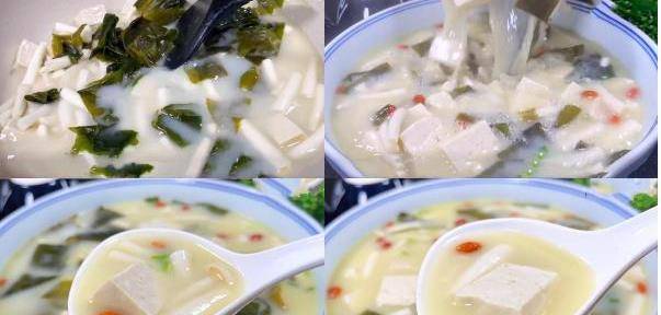 4、鍋中燒開水,加入少許的食鹽,將豆腐煮熟,這樣可以去除豆腐皮的味道,將海藻和海藻一起煮熟,取出。