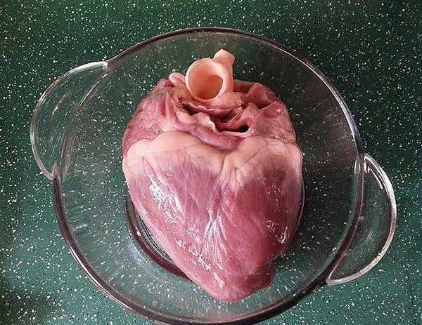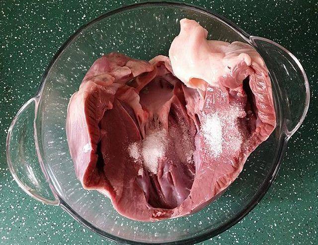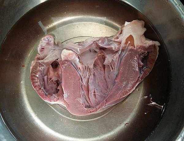 5、將醃好的豬心、沖洗幹凈後放入