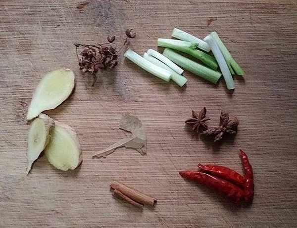 輔料:花椒、蔥段、香葉、八角、桂皮、生薑、幹辣椒