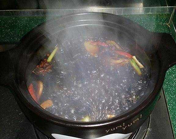 3、砂鍋中:放入大料、食鹽、白糖、清水、料酒、老抽和魚露