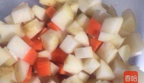 1.原料清洗幹凈後,土豆,胡蘿卜,雞腿肉全部切成小塊