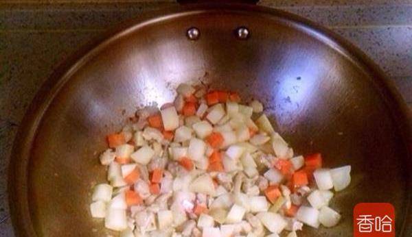 3.下入土豆胡蘿卜塊翻炒至土豆表面有一層油煎的感覺,加入料酒生抽