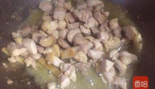 2.鍋內入少許油加熱,下入雞塊翻炒至肉質發白