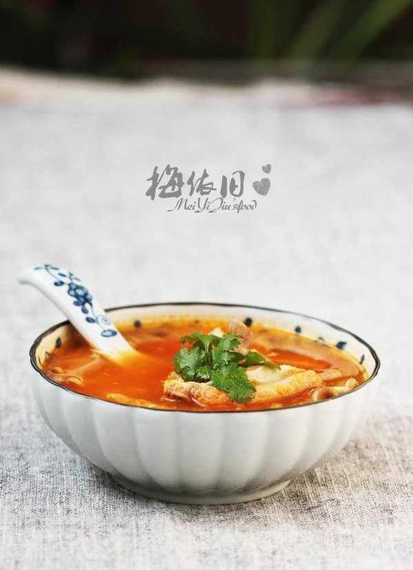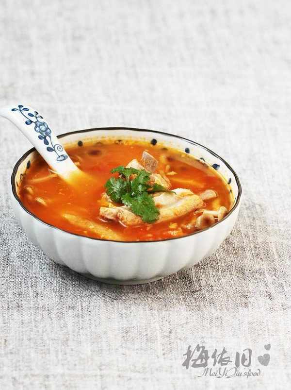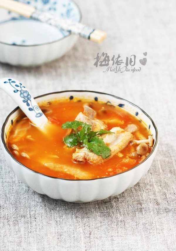 番茄排骨湯,色澤濃鬱漂亮,看上去艷艷的一片,又像是一團紅色的火,紅的湯水中一塊塊,整整齊齊地站在一起,沾滿瞭紅紅的番茄汁,也成瞭一朵朵盛開的花。