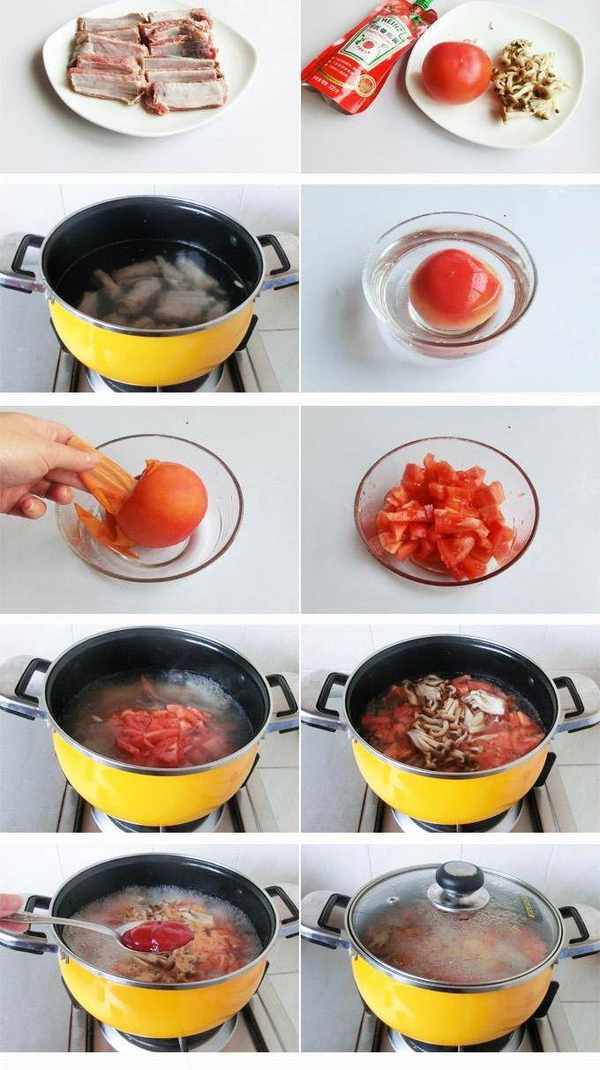 4、待排骨爛熟時,再加入番茄、蟹味菇、番茄醬、鹽,再燉至番茄軟爛,就可以關火盛出瞭