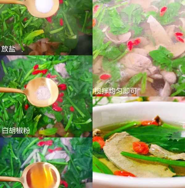 3、水開放豬肝煮1分鐘放菠菜和枸杞煮至斷生,調入鹽、白胡椒粉和香油,攪拌均勻即可出鍋享用瞭,巨好喝。
