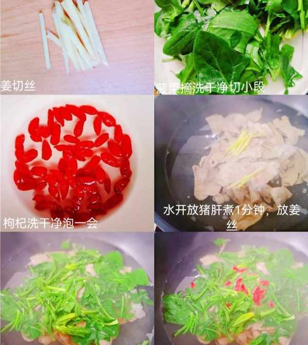 食材:豬肝300克,菠菜3棵,薑1小塊,枸杞子1小把,鹽2小勺,料酒1勺,淀粉1小勺,白胡椒粉1小勺,香油1勺,清水適量;