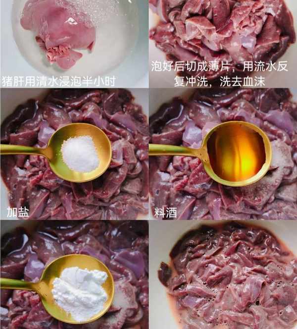 1、豬肝放清水裡浸泡半小時,再切成薄片用流水反復沖洗,洗去血沫,放碗裡+鹽+料酒+淀粉抓勻醃制10分鐘;