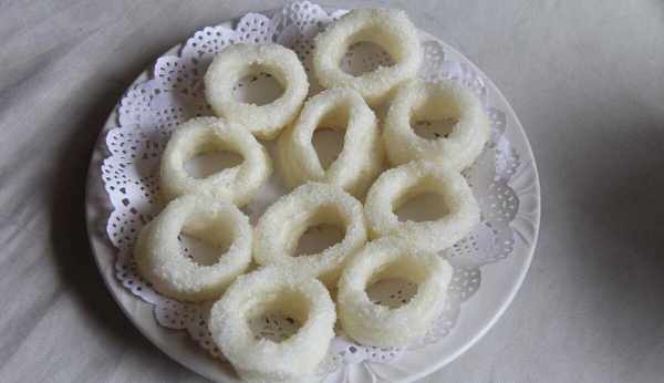 白糖糕是“江西五大傳統名點”,它的制作比較復雜,要先把糯米經浸泡、洗濾,入石臼舂成細粉,沖開水揉和,搓為細條,展為薄片,多層疊起,彎轉成圈,入油炸至金黃,起鍋濾油,以白糖、米粉混和撒於糕上。