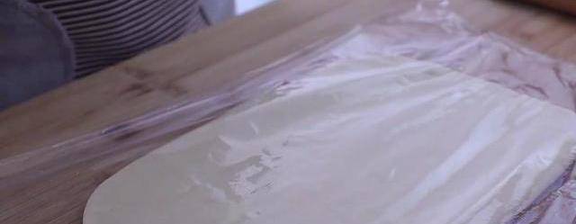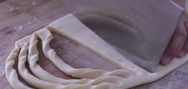 好以後給他整理一下,整理成長方形,蓋上保鮮膜醒面40分鐘,醒面時間越長,筋性越大,面醒好以後用刀給它切成一厘米寬的面條,一邊切一邊撥開,面條不要切得太細,容易拉斷,6根一組給它切開。取一組面條,反方向給他轉一圈,在捏住兩頭向兩邊拉伸,這樣就可以瞭。