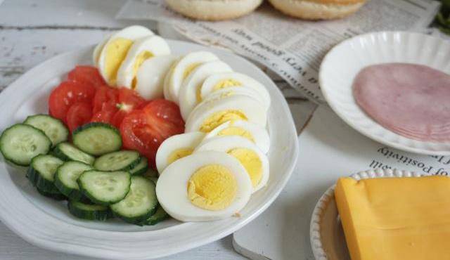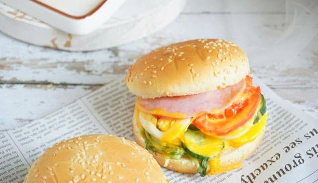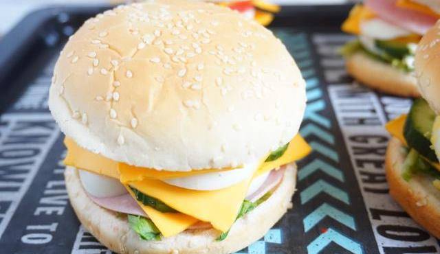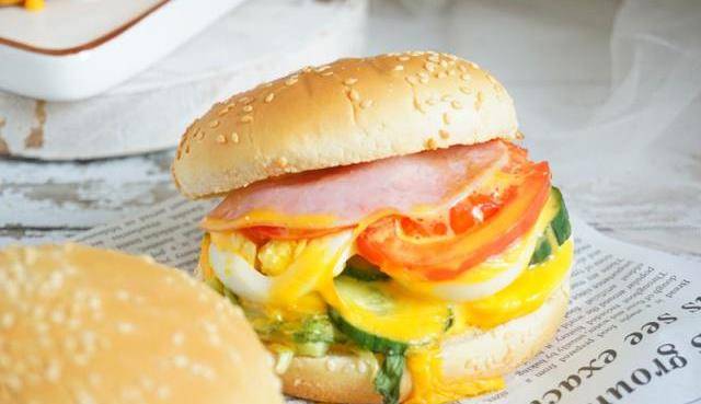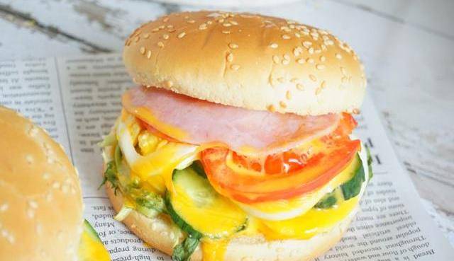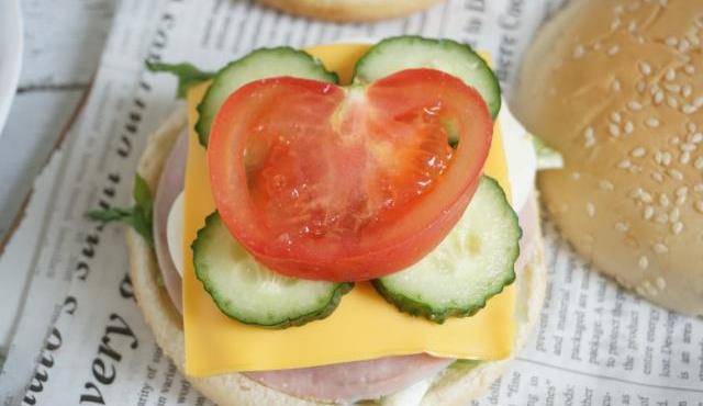 食材:漢堡坯4個,西紅柿一個,黃瓜一根,美式火腿片8片,雞蛋4個,切達芝士片4-8片,苦苣或生菜適量,沙拉醬或千島醬適量。