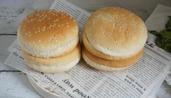 5.蓋上另一片,這樣一份漢堡包就擺好瞭。將烤箱180度預熱時,將其他3份也一並做好,放在鋪好烘焙油紙的烤盤上。