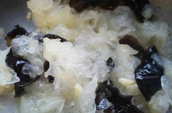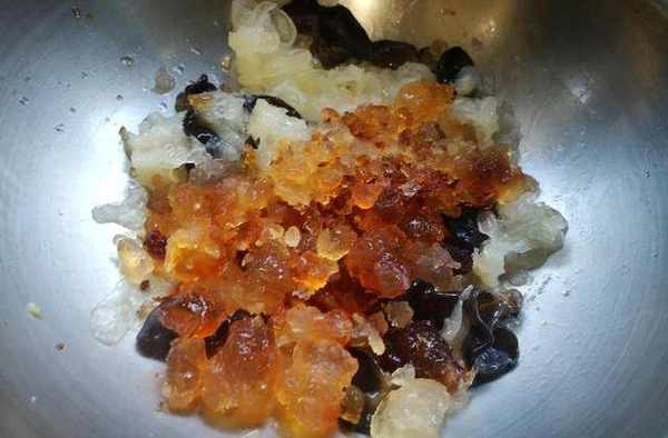 桃膠10粒、銀耳2朵、黑木耳適量、鹽少許、老薑1塊、大蒜1瓣、蠔油少許、香油幾滴、濕淀粉少許