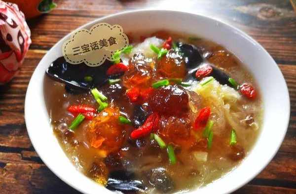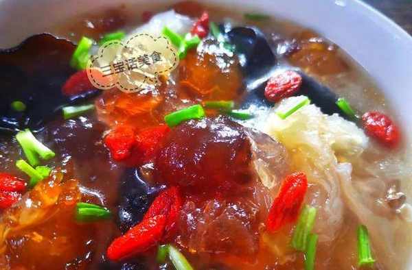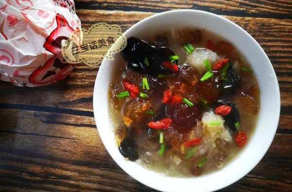 撒上幾顆枸杞子,點綴上一點小香蔥,這道咸味的桃膠雙耳羹就做好啦。入口軟糯滑爽,咸鮮適口,食後唇齒生香,既可以美容,又可以當菜吃,真的非常美味哦,而且做起來也是非常的簡單。女孩子隔三差五地吃點桃膠羹,可以養顏美容,保養皮膚,愛美的女生一定不要錯過哦。