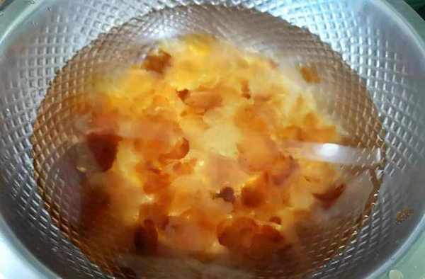 1.提前24小時泡上桃膠,等泡軟後順著一個方向攪拌一會兒,讓雜質慢慢沉淀下來,然後清洗幹凈,裝盤備用;