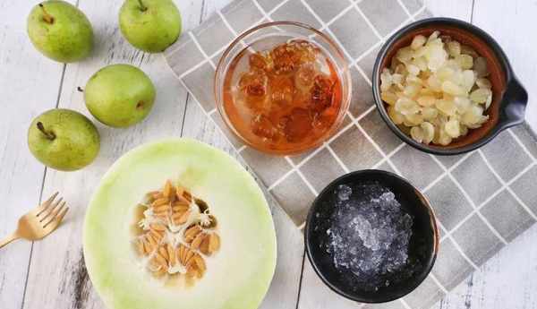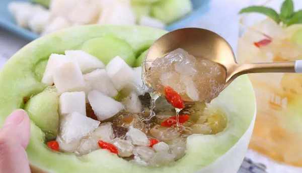 梨去皮切成丁,香瓜對半切開,去籽挖出果肉,待雪燕桃膠皂角米放涼,舀入香瓜中,放上果肉