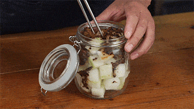 蓋上蓋子搖晃均勻,密封靜置1小時,然後倒過來再醃制1小時,此時已醃出瞭很多水份