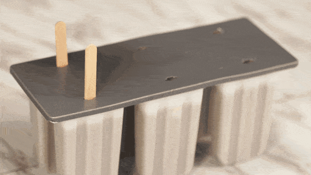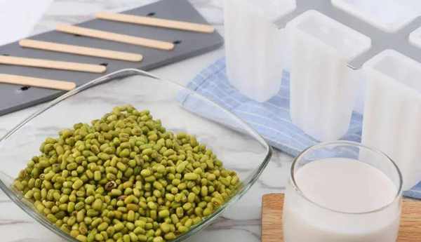 將前面煮好的綠豆沙,依次倒入模具至七成滿,然後倒入椰汁,插上木簽,放冰箱冷凍3~4小時即可
