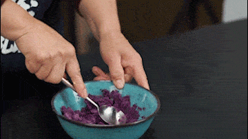 趁這個時間,將蒸好的紫薯壓成泥,再倒入少量椰汁攪拌均勻備用