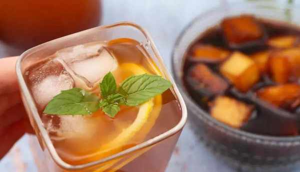 在杯子裡舀上紅糖冬瓜汁,加些冰塊、檸檬片,再倒入純凈水,最後放上幾片薄荷葉點綴,開喝!