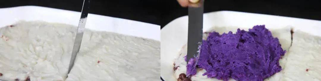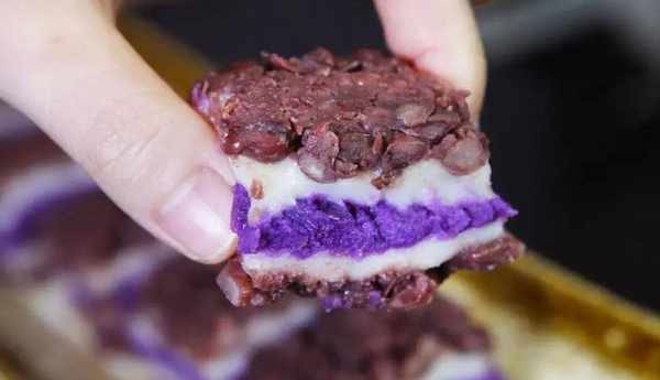 蒸好的紅豆取出,從中間切一刀,選擇其中一半鋪上一層紫薯泥,鋪好紫薯泥之後,把另一半對折過來,疊成型,然後切成小塊即可。
