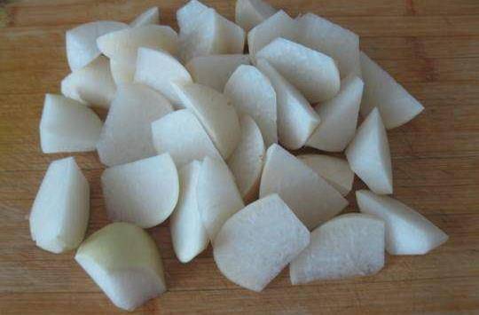 5,蘿卜洗凈切滾刀塊。