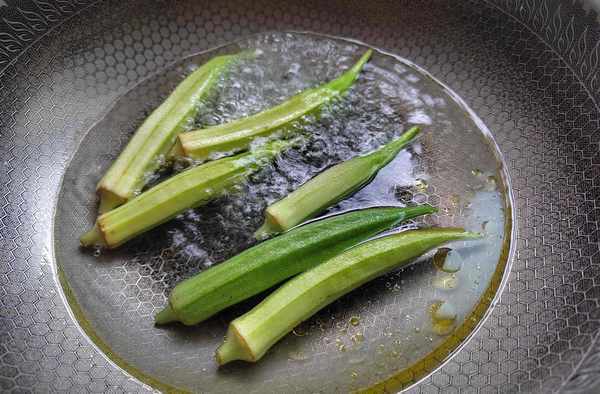 第七步:另外燒一鍋開水,淋入少許花生油,放入洗凈的秋葵,大火煮2分鐘。