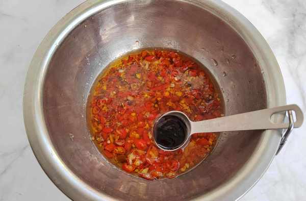 配料:紅辣椒10個;大蒜子半個;生薑1塊;花生油40克;鹽3克;生抽20克;蠔油10克;料酒40克;涼拌醋10克;白糖6克。