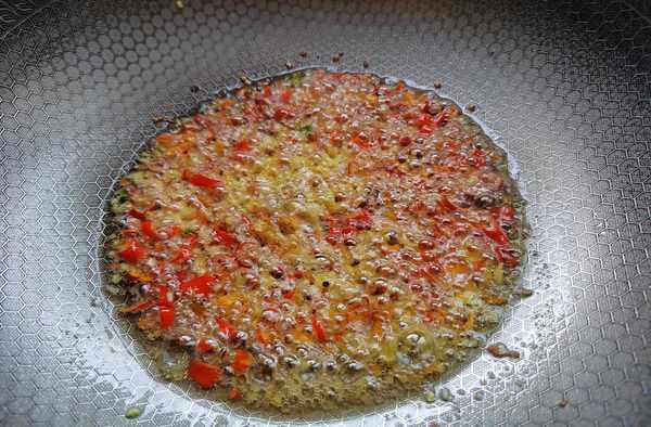 第三步:熱鍋倒入花生油,燒熱後,再放入紅辣椒、生薑、大蒜子,爆出香味。