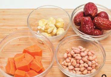 2紅棗洗凈,切小口。花生、栗子洗凈。木瓜削皮去籽,切塊備用。