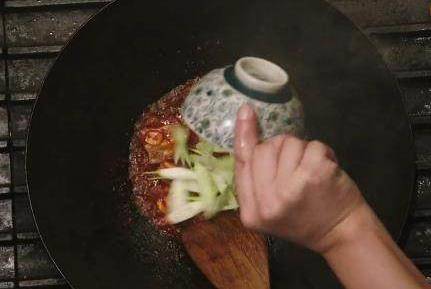 倒入切好的青蒜和辣椒,翻炒均勻,加鹽調味,出鍋。
