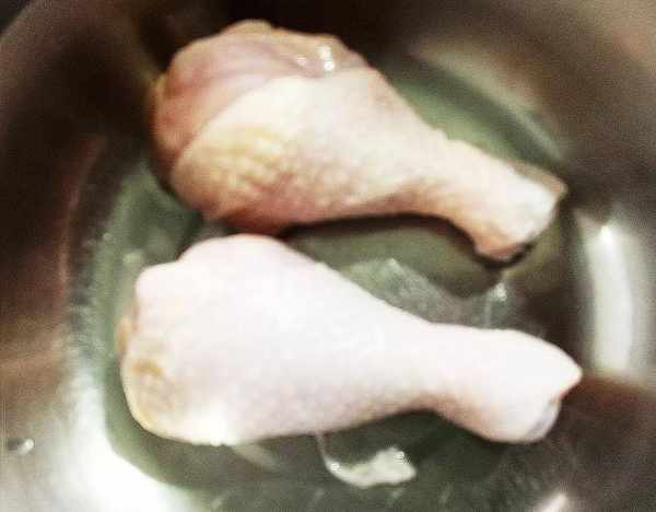 散養雞腿兩隻,用料酒加清水泡30分鐘去掉毛腥味,再洗幹凈。