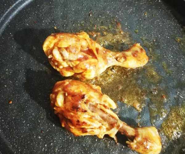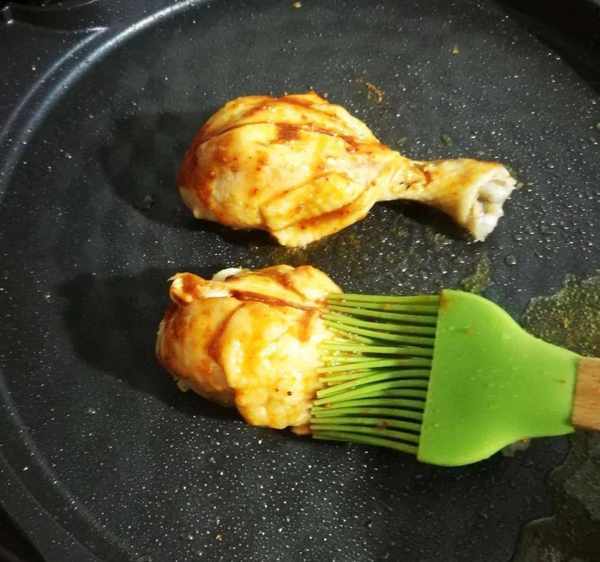 電餅鍋或者平底鍋,放少許油,雞腿刷上烤肉醬,兩面煎香,邊煎邊刷,更入味。如果傢裡沒有烤肉醬,可以刷上醬油和辣椒油調色也可以。