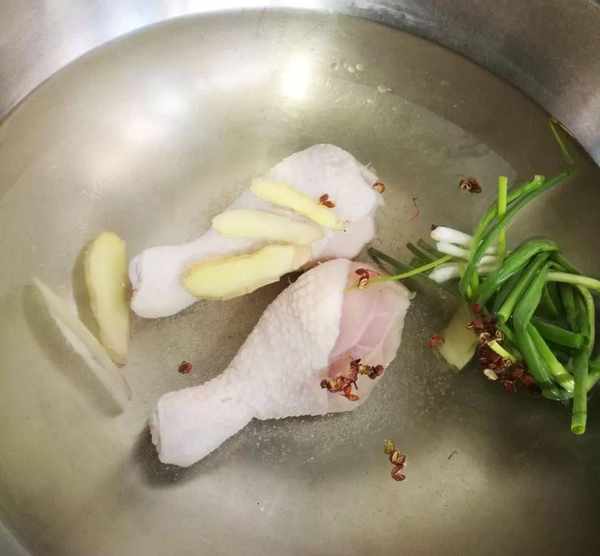 鍋中加清水適量,放入雞腿、薑片、鹽、蔥結、花椒、料酒,大火煮開,再轉小火煮20~30分鐘。