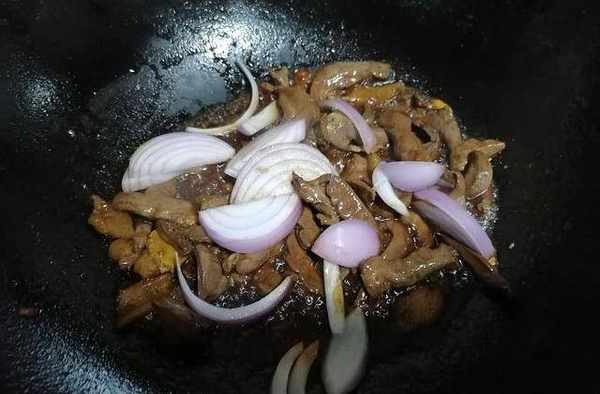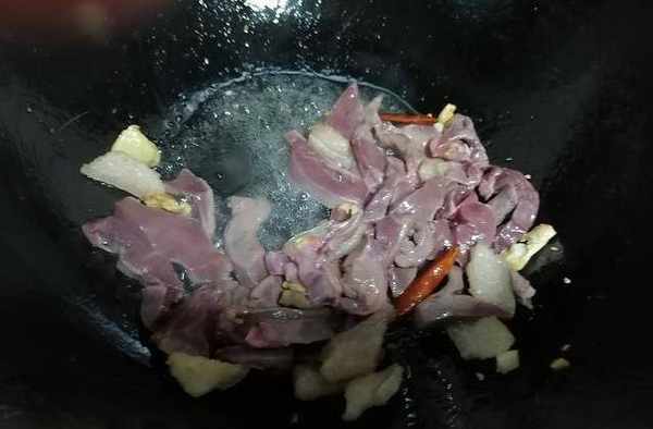 3.鍋中香味出來之後,我們便可以加入豬心進行翻炒。每次炳哥做到這裡的時候,下豬心那個滋的一聲,隨後傳來數道香氣,那種感覺總是會叫我食欲大開,實在是太香瞭。