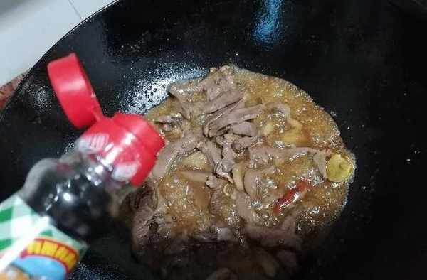 4.等豬心翻炒得差不多時,我們開始加入一點點水和醬油等調味品,利用調味品對豬心進行提鮮以及上色,保證一會兒出鍋時的口感和香氣。