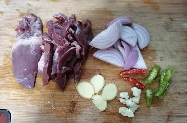 1.炒豬心的做法很多,這次炳哥教大傢一個簡單又美味的做法,首先,我們將買好的食材處理一下。豬心切片、洋蔥切塊、生薑切片,青辣椒切開,大蒜拍碎,一切準備就緒後就可以開始下一步。
