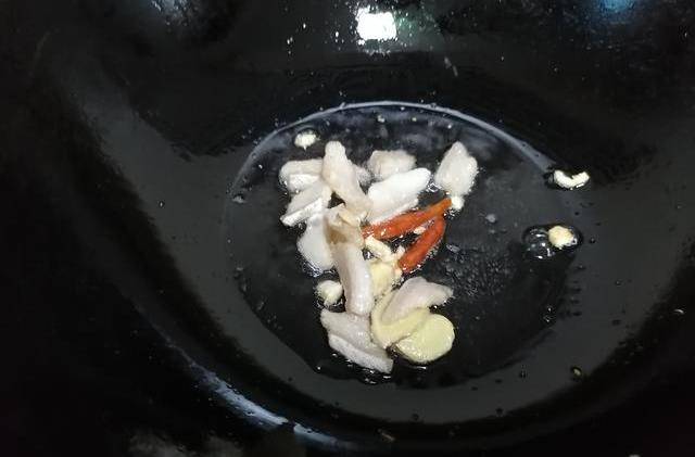 2.首先起鍋熱油,油少量,然後加入肥肉、紅辣椒、大蒜以及生薑進行爆香。因為有用肥肉爆香,所以在起初熱鍋的時候,食用油可以少放一點,以防太過油膩。