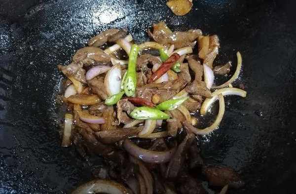 6.待洋蔥的略微沉底,我們便可以將等待已久的青紅辣椒一起請入鍋中,讓兩位“辣椒大仙”參加進這場歡愉的豬心盛宴中。辣椒多少都由大傢自己調配,喜好重口的朋友多放一點,來一個辣得過癮,反之,提提味就好,不要放得太多。