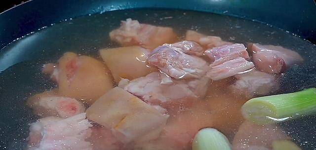 5.起鍋燒水,冷水下入豬蹄,加幾片生薑跟蔥白。開大火把水煮開。