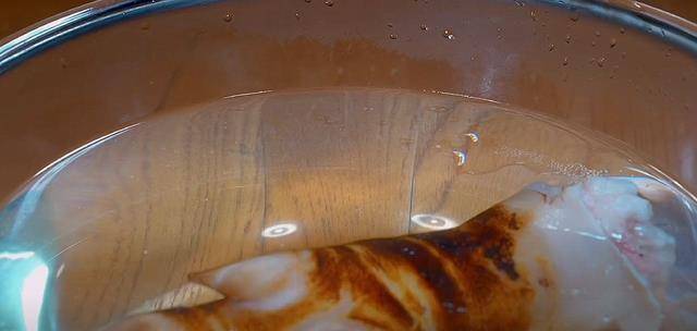 2.然後放入溫水中把表面焦黑部位泡軟。